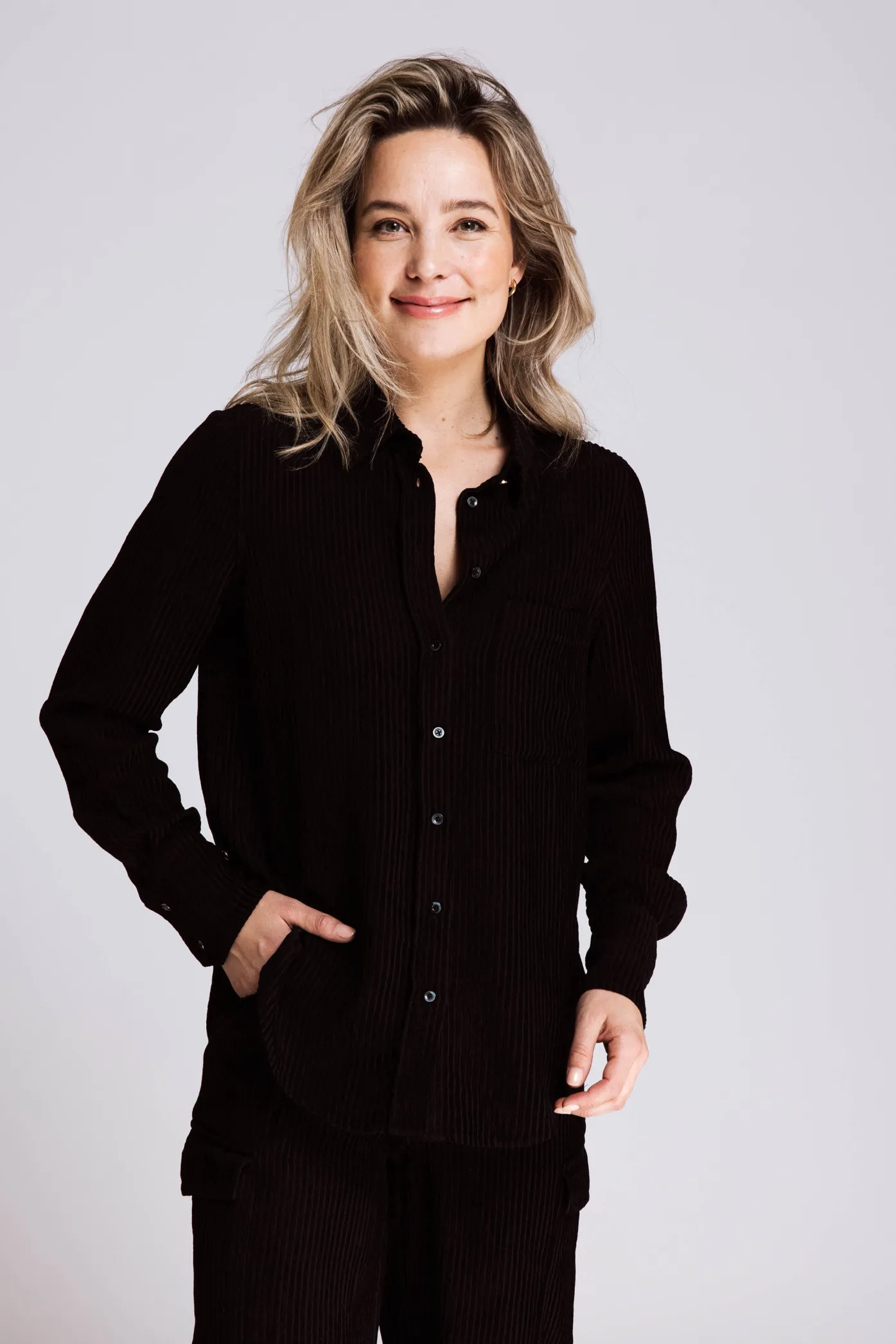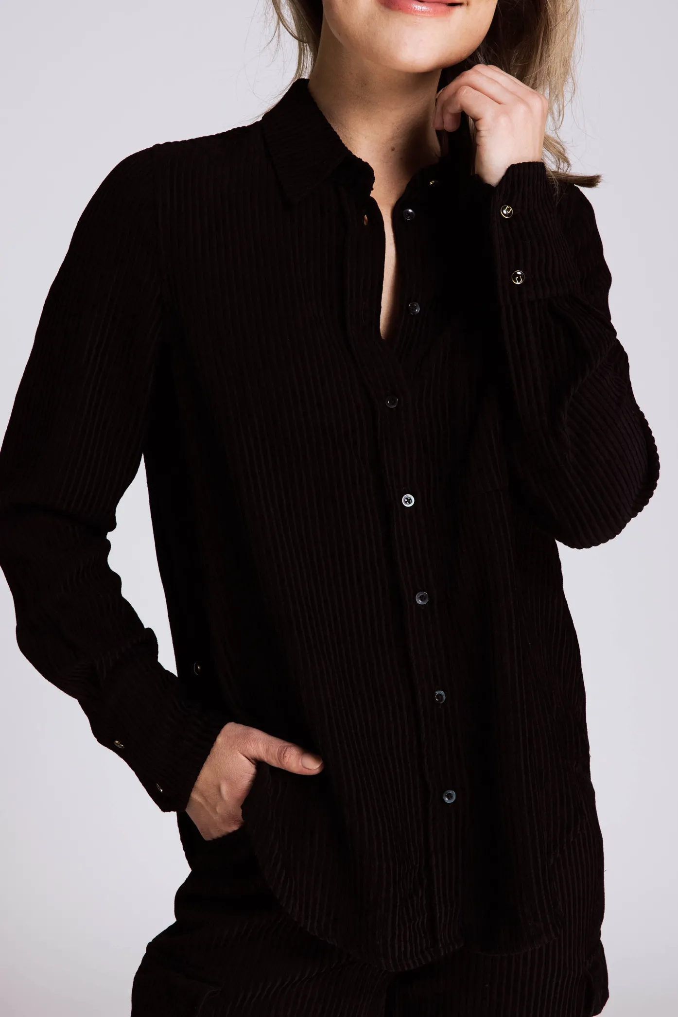 - Durchgehende Knopfleiste mit dezent glänzenden Knöpfen